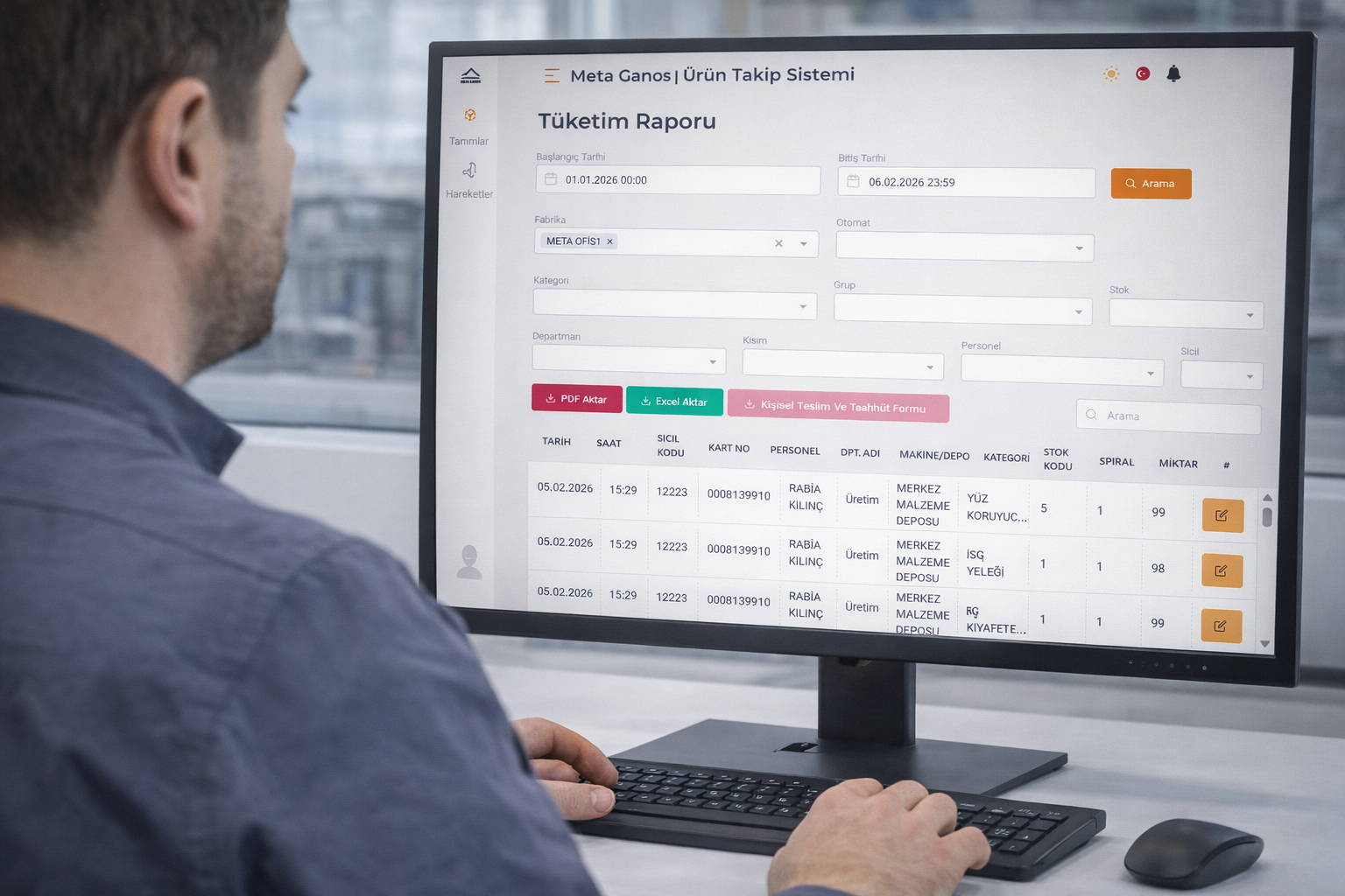 İLGİLİ KULLANICILAR YAZILIM ÜZERİNDEN TÜKETİM RAPORLARINI PERSONEL-DEPARTMAN-BÖLÜM-ÜRÜN-ÜRÜN GRUPLARI, MAKİNE, ÜLKE, FABRİKA OLARAK RAPORLAYABİLMELİ VE EXCEL, PDF, HTML FORMATLARINDA ÇIKTI ALABİLMEKTEDİR.